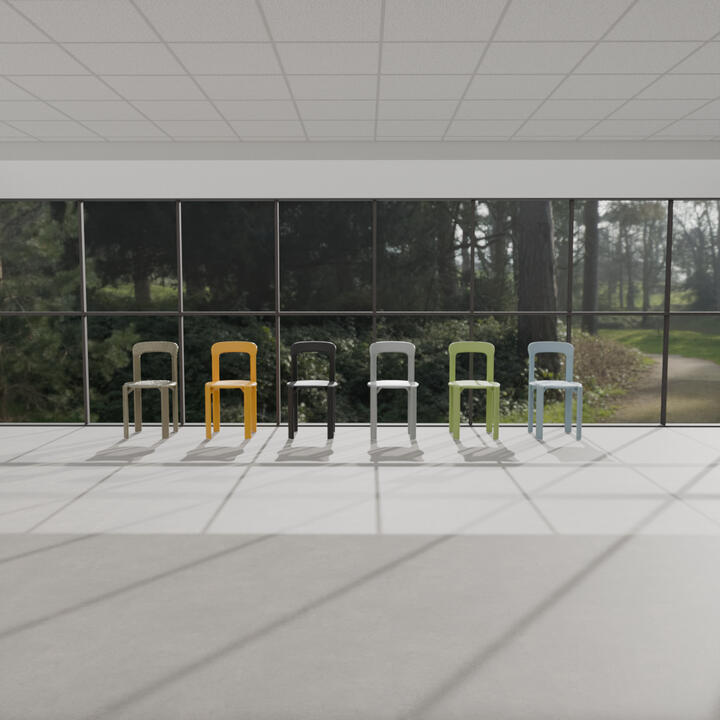 木目調の座面と青いスチールの脚が特徴です。