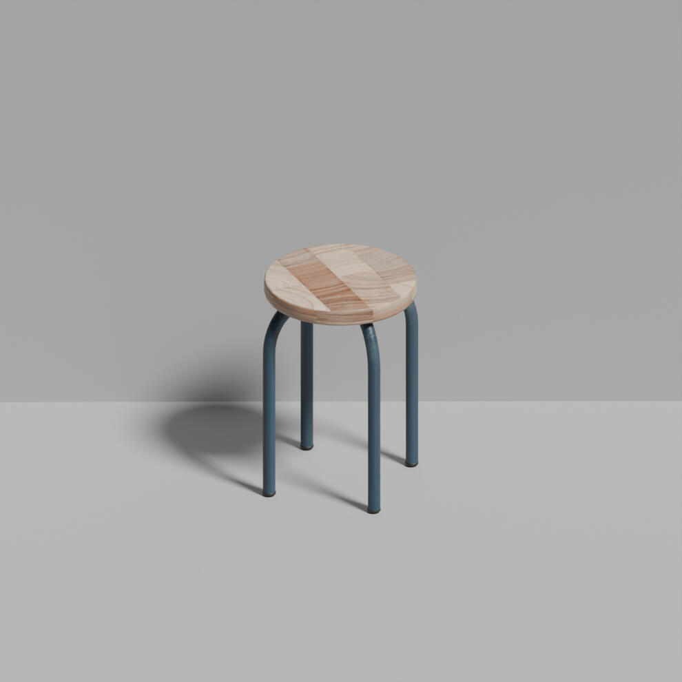 The "Timber Stool" features a wood-textured seat and blue steel legs, blending natural warmth with modern elegance to create a stylish interior accent.
