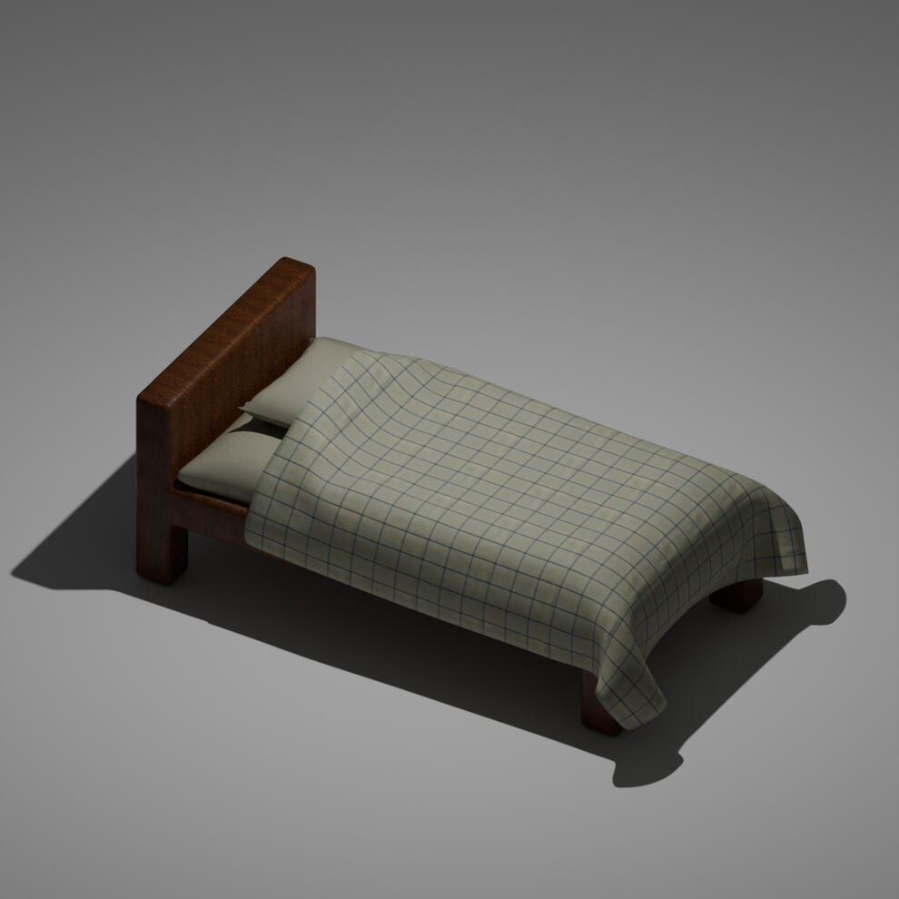 The "Blue Plaid Bed" features a cozy blue plaid duvet and a warm wood-grain frame, blending classic charm with a refined and inviting aesthetic.